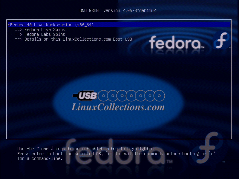 | The Fedora USB collection provides all of the Fedora releases, including Live Spins (with different Desktop environments like Cinnamon, KDE, etc.), and Fedora Labs releases, all on a bootable USB! This boots to a menu where you can easily select each release, and decide what best meets your wants and needs. Selected options can be installed onto a hard drive from within the running selected environment. Lab releases includes Games, Scientific, Design, Security, etc. This is a 128GB USB Drive with a boot partition, grub/iso partition, and a 2 GB user data partition. |  | | Description: | Fedora 42 Workstation DVD (x86-64), Fedora 42 Live SoaS DVD (x86-64), Fedora 42 Live LXDE DVD (x86-64), Fedora 42 Live LXQt DVD (x86-64), Fedora 42 Live Cinnamon DVD (x86-64), Fedora 42 Live KDE DVD (x86-64), Fedora 42 Live MATE DVD (x86-64), Fedora 42 Live Budgie DVD (x86-64), Fedora 42 Live XFCE DVD (x86-64), Fedora i3 Live DVD (x86_64), Fedora Labs Games DVD (x86_64), Fedora Labs Python Classroom DVD (x86_64), Fedora Labs Security Lab DVD (x86_64), Fedora Labs Scientific Suite DVD (x86_64), Fedora Labs Comp Neuro DVD (x86_64) and Fedora Labs JAM (Music) DVD (x86_64), all included on a bootable name-brand USB (Note: DVD ISO images on USB media, NOT actual physical DVD optical media!) | | Collection Items: | 55820 55822 55823 55824 55825 55826 55827 55828 55829 [Fedora i3 Live DVD (x86_64)] [Fedora Labs Games DVD (x86_64)] [Fedora Labs Python Classroom DVD (x86_64)] [Fedora Labs Security Lab DVD (x86_64)] [Fedora Labs Scientific Suite DVD (x86_64)] [Fedora Labs Comp Neuro DVD (x86_64) and Fedora Labs JAM (Music) DVD (x86_64)] |
